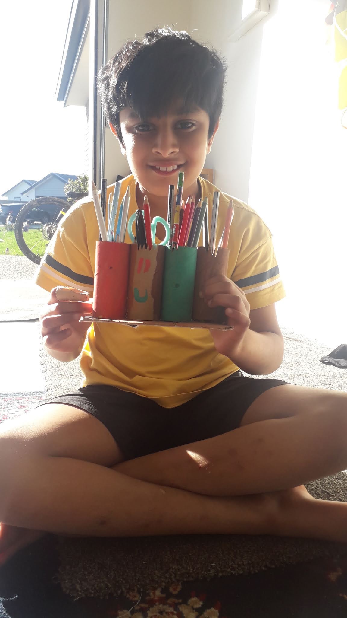 Aaron has been working on his recycling challenge and has recycled yoghurt pottles and muffin packets into seed planters. He has been planting lots of herb seeds like corriander and chilli and pumpkin seeds that will be great to use in cooking once they have grown. He also turned toilet roll holders into pencil holders with a bit of paint they look so cool. Well done Aaron - it is lovely to see what everyone is doing.